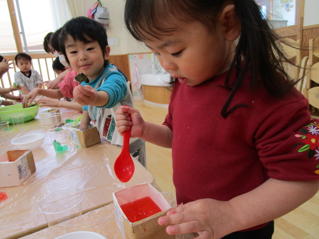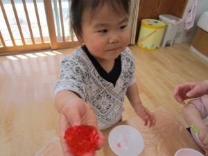 今回は、ゼラチン遊び。 ちょこっと感触が違うよ。