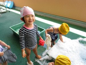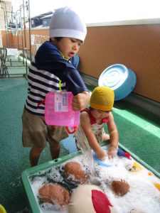 今日は楽しみにしていたお洗濯の日。いつもままごとでお洗濯をしていた子どもたちは、本物の洗濯をすることになりました。