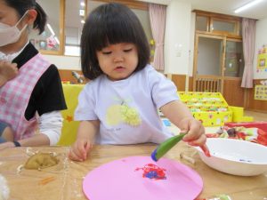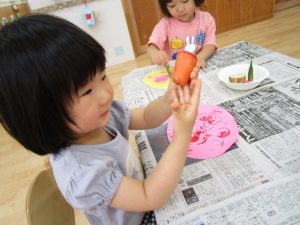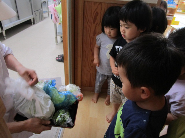 調理員さんの協力でみんなが食べている野菜の皮を少し分けていただき、野菜を直接触って遊んでみました。
